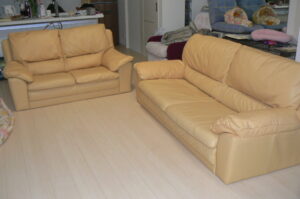 本革のソファーはお手入れしないと割れてきたり剥げてきたりします。「すわり心地はいいんだけど見た目がひどくなってきた」そんなときは同じ色を塗ることによってきれいに修復できます。肌触りが少し堅く感じるようになりますが見た目は大変きれいになります。ひどい場合は「部分張替え+色あわせ」という対応ができます。