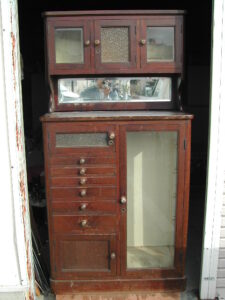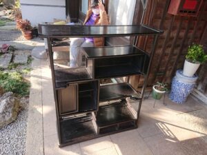 65年ほど前の飾り棚の修理を依頼されました。 お客様のおじいい様が使用されていたもので、大変古く傷みも激しいものでした。 塗装を剥がし、取り替えられるものは取り替え、再塗装して修復いたしました。